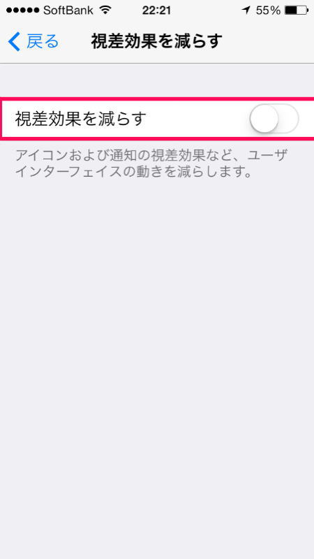 確かに特徴的で魅力的でもありますが、このエフェクトにはグラフィック処理が要求され、当然ですが電力を消費します。iPhone 5などの旧機種をiOS 7にアップデートすると、特に電池の減りが早くなったように感じる原因のひとつにもなっています。
